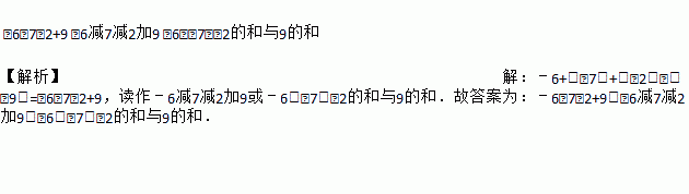 ﹣6﹣7﹣2+9 ﹣6减7减2加9 ﹣6,﹣7,﹣2的和与9的和 【解析】【解析】 ﹣6+(﹣7)+(﹣2)﹣(﹣9)=﹣6﹣7﹣2+9,读作﹣6减7减2加9或﹣6,﹣7,﹣2的和与9的和.故答案为:﹣6﹣7﹣2+9;﹣6减7减2加9;﹣6,﹣7,﹣2的和与9的和.
