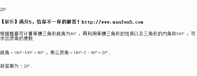 已知等腰三角形的一个底角的外角等于100°,则它的顶角为______________.
