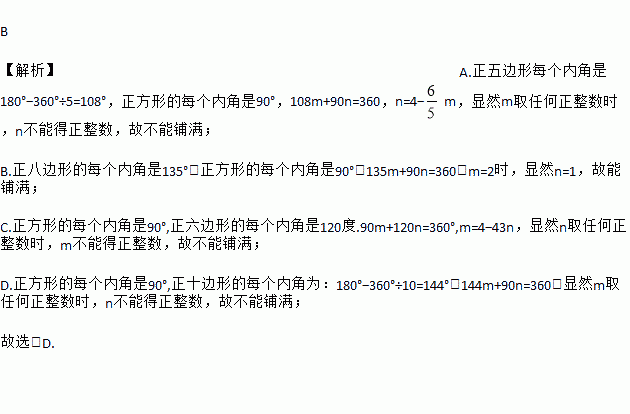 B 【解析】A.正五边形每个内角是180°?360°÷5=108°,正方形的每个内角是90°,108m+90n=360,n=4?m,显然m取任何正整数时,n不能得正整数,故不能铺满; B.正八边形的每个内角是135°,正方形的每个内角是90°,135m+90n=360,m=2时,显然n=1,故能铺满; C.正方形的每个内角是90°,正六边形的每个内角是120度.90m+120n=...