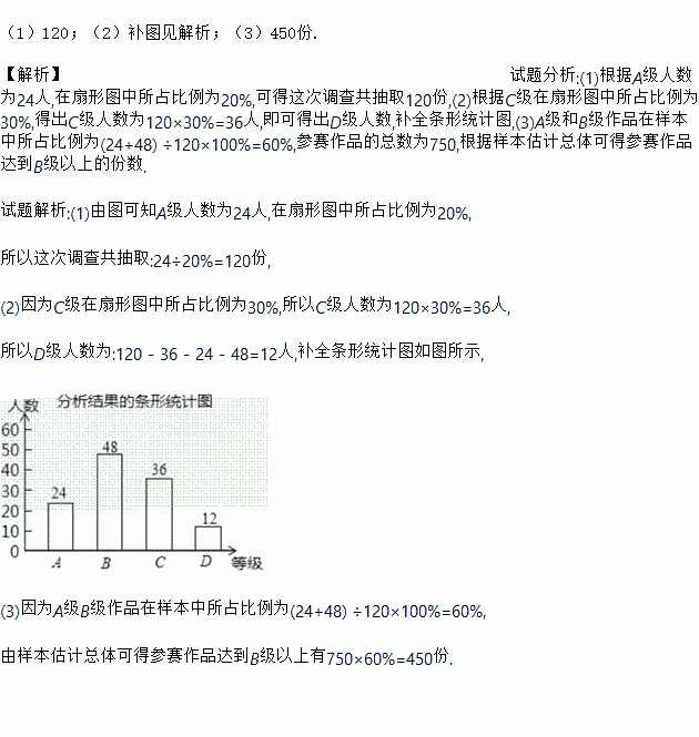 (3)已知该校这次活动共收到参赛作品750份,请你估计参赛作品达到B级以上(即A级和B级)有多少份?