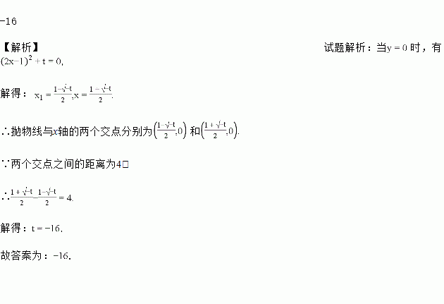 抛物线y=(2x﹣1)2+t与x轴的两个交点之间的距离为4,则t的值是_____.