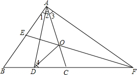 分析:(1)由AD为△ABC的角平分线,AD的中垂线交AB于点E、BC的延长线于点F,易得∠1=∠2,∠4=∠DAF=∠2+∠3,又由三角形外角的性质,即可证得:∠3=∠B;