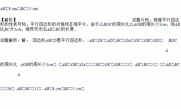 如图,?ABCD的周长为26 cm,AC,BD相交于点O,△BOC的周长比△AOB的周长小3 cm,求AB,BC的长.