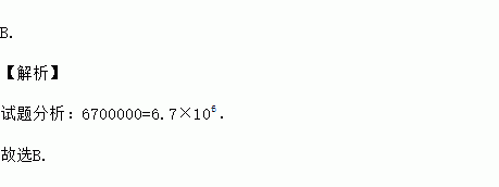 B. 【解析】 试题分析:6700000=6.7×106. 故选B.