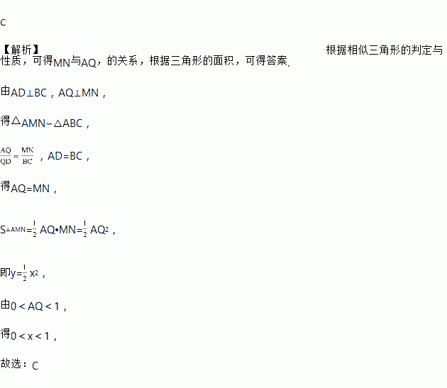 如图,在△ABC中,AB=AC,AD⊥BC,垂足为D,AD=BC=1.点Q是AD上的一个动点,过点Q垂直于AD的直线分别交AB、AC于M、N两点,设AQ=x,△AMN的面积为y,则y关于x的函数图象大致形状是( )