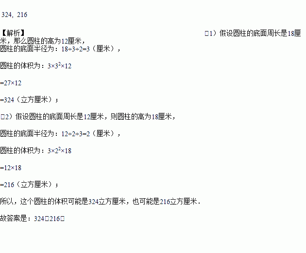 把圆柱的侧面展开得到一个长18厘米、宽12厘米的长方形。这个圆柱的体积可能是_________立方厘米,也可能是_________立方厘米。(本题中的Л取近似值3)。