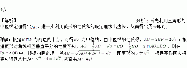 如图,菱形ABCD的对角线AC,BD相交于O点,E,F分别是AB,BC边上的中点,连结EF.若EF=,BD=4,则菱形ABCD的周长为_____________.