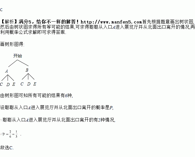 某奥体中心的构造如图所示,其东、西面各有一个入口A、B,南面为出口C,北面分别有两个出口D、E.聪聪若任选一个入口进入,再任选一个出口离开,那么他从入口A进入并从北面出口离开的概率为( )