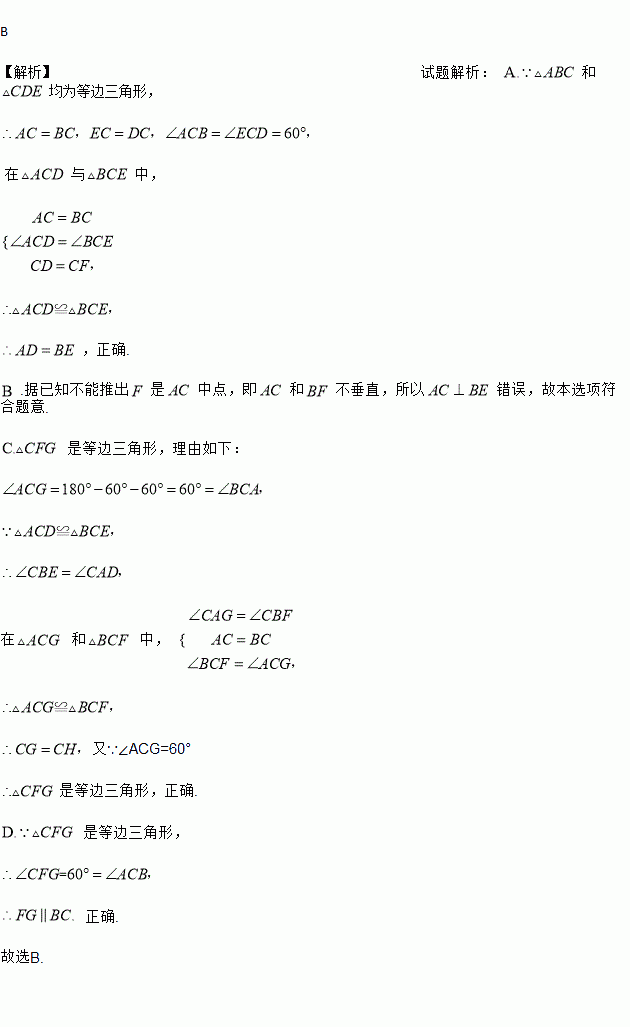 B 【解析】试题解析: 和均为等边三角形, 在与中, ,正确. .据已知不能推出是中点,即和不垂直,所以错误,故本选项符合题意. 是等边三角形,理由如下: 在 和 中, 又∵∠ACG=60° 是等边三角形,正确. 是等边三角形, 正确. 故选B.