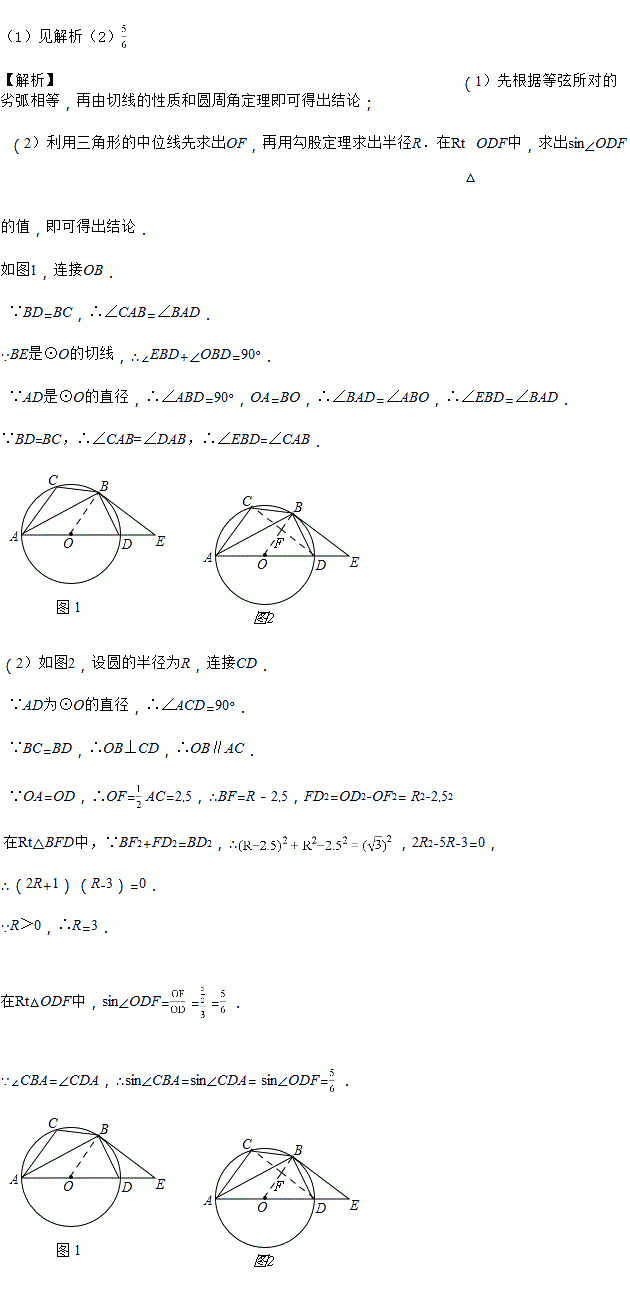 如图,已知⊙O是△ABC的外接圆,AD是⊙O的直径,且BD=BC,延长AD到E,BE是⊙O的切线,B是切点.