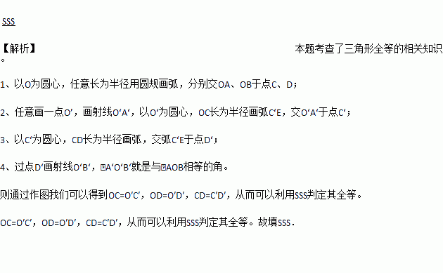 用直尺和圆规作一个角等于已知角的示意图如下,则要说明∠D′O′C′=∠DOC,需要证明△D′O′C′≌△DOC,则这两个三角形全等的依据是__(写出全等的简写).