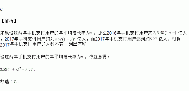 近几年,手机支付用户规模增长迅速,据统计2015年手机支付用户约为3.58亿人,连续两年增长后,2017年手机支付用户达到约5.27亿人.如果设这两年手机支付用户的年平均增长率为x,则根据题意可以列出方程为( )