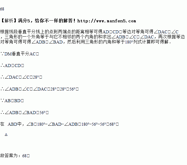 如图,在△ABC中,DM垂直平分AC,交BC于点D,连接AD,若∠C=28°,AB=BD,则∠B的度数为_____度.