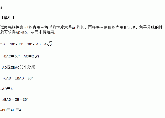 如图,在△ABC中,∠C=90°,∠B=30°,AD是∠BAC的平分线.已知AB=,那么DB=__________.