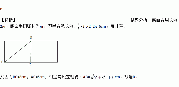 如图,一圆柱高8cm,底面半径2cm,一只蚂蚁从点A爬到点B处吃食,要爬行的最短路程(π取3)是( )