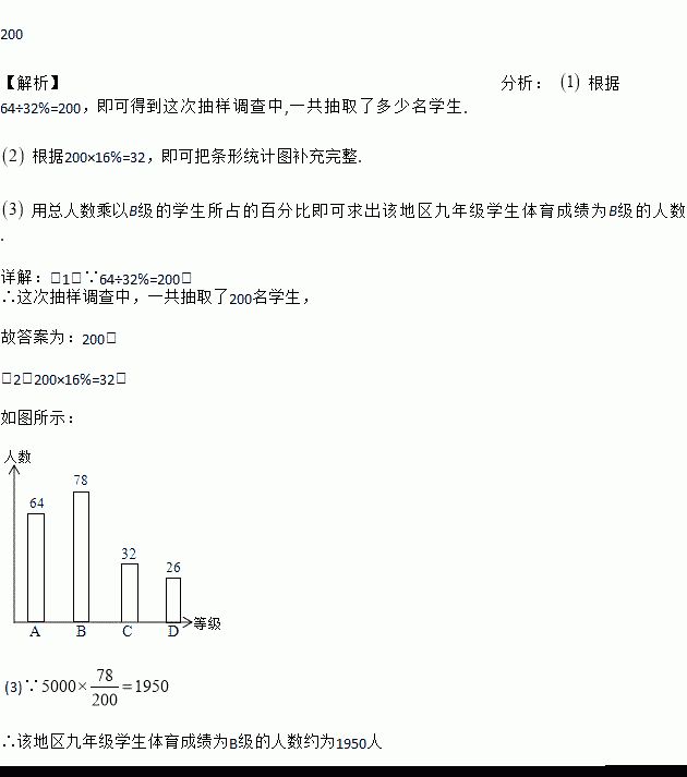 为了解某地区5000名九年级学生体育成绩状况,随机抽取了若干名学生进行测试,将成绩按A,B,C,D四个等级进行统计,并将统计结果绘制成如下的统计图,请你结合图中所给信息解答下列问题: