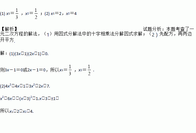 (1) x1=,x2=;(2) x1=2,x2=4 【解析】试题分析:本题考查了一元二次方程的解法,(1)用因式分解法中的十字相乘法分解因式求解;(2)先配方,再两边开平方. 【解析】 (1)(3x-1)(2x-1)=0. 则3x-1=0或2x-1=0,所以x1=,x2=. (2)4x2-4x+1=3x2+2x-7. x2-6x=-(x-3)2=1.x-3=±1, ...