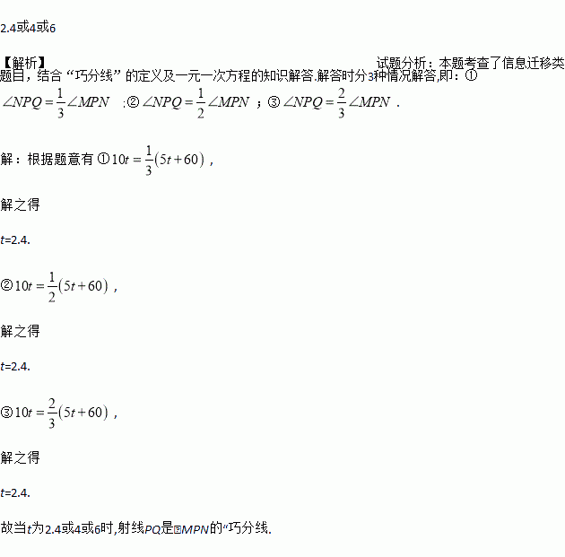 如图1,射线OC在∠AOB的内部,图中共有3个角:∠AOB,∠AOC和∠BOC,若其中有一个角的度数是另一个角度数的两倍,则称射线OC是∠AOB的“巧分线”.如图2,若∠MPN=60°,且射线PQ绕点P从PN位置开始,以每秒10°的速度逆时针旋转,当PQ与PN成180°时停止旋转,旋转的时间为t秒.若射线PM同时绕点P以每秒5°的速度逆时针旋转,并与PQ同时停止,当t=____秒,射线PQ是∠MPN的“巧分线”.