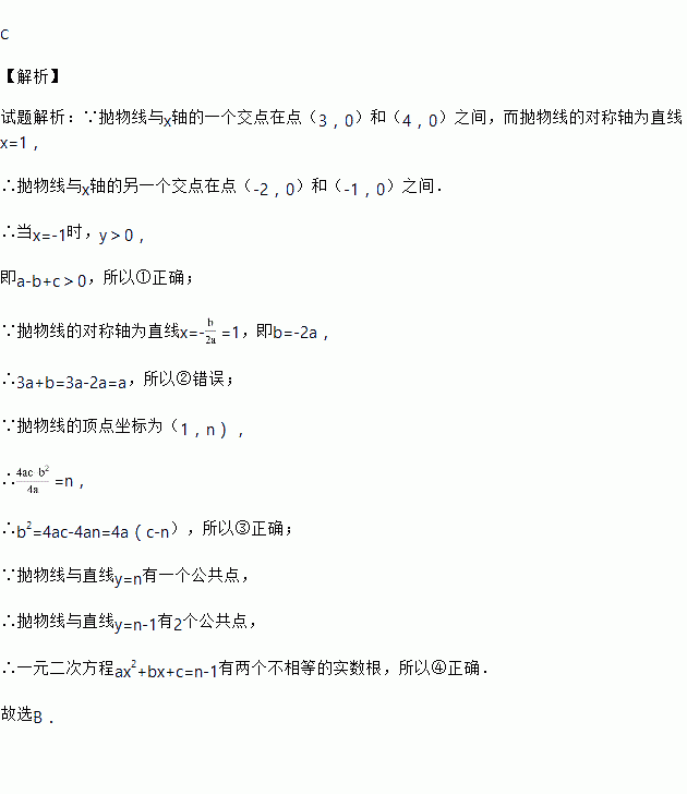 如图是抛物线y=ax2+bx+c(a≠0)的部分图象,其顶点是(1,n),且与x的一个交点在点(3,0)和(4,0)之间,则下列结论:①a-b+c>0;②3a+b=0;③b2=4a(c-n);④一元二次方程ax2+bx+c=n-1有两个不等的实数根.其中正确结论的个数是( )