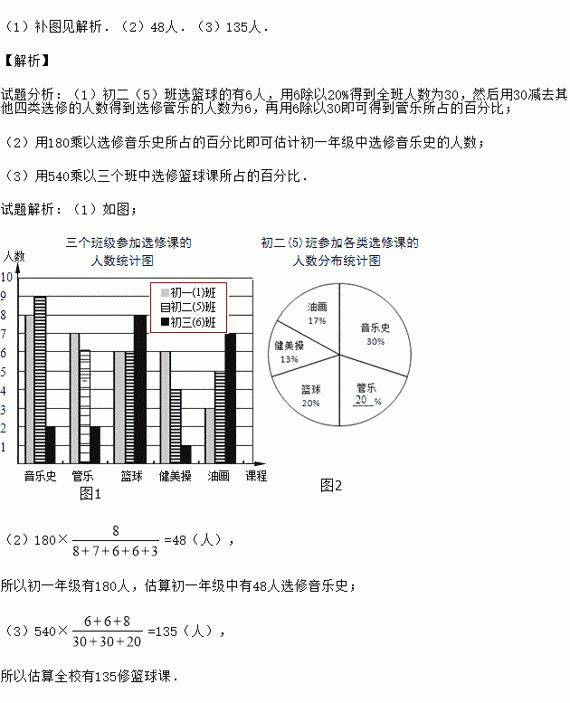 为响应推进中小学生素质教育的号召,某校决定在下午15点至16点开设以下选修课:音乐史、管乐、篮球、健美操、油画.为了解同学们的选课情况,某班数学兴趣小组从全校三个年级中各调查一个班级,根据相关数据,绘制如下统计图.