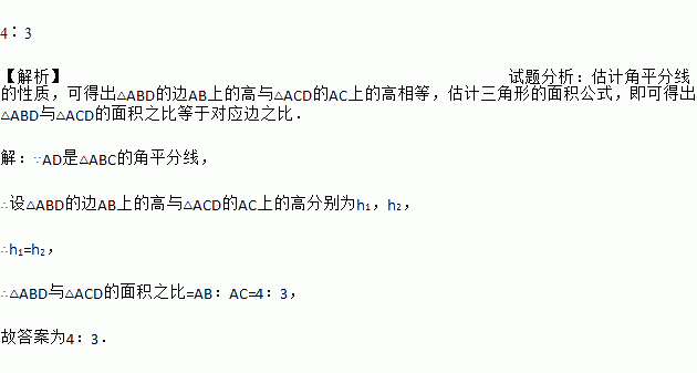如图,在△ABC中,AB=4,AC=3,AD是△ABC的角平分线,则△ABD与△ACD的面积之比是_.