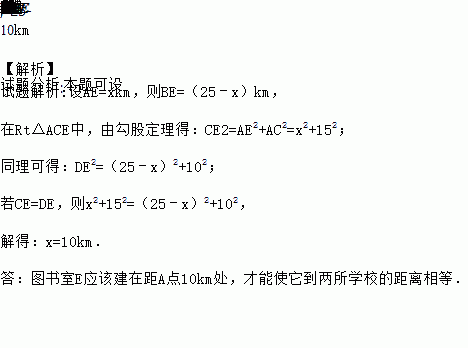 为了丰富少年儿童的业余生活,某社区要在如图所示AB所在的直线建一图书室,本社区有两所学校所在的位置在点C和点D处,CA⊥AB于A,DB⊥AB于B,已知AB=25km,CA=15km,DB=10km,试问:图书室E应该建在距点A多少km处,才能使它到两所学校的距离相等?