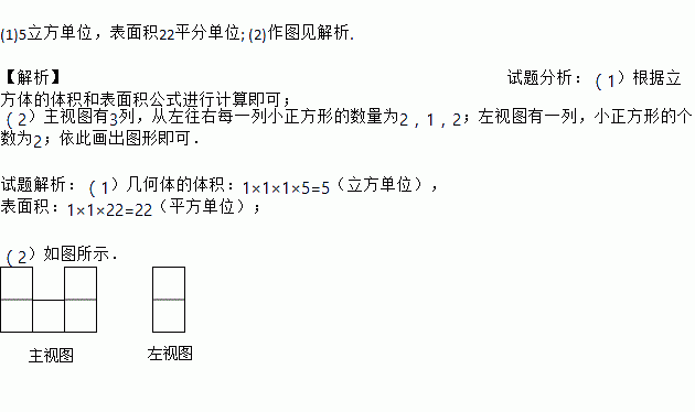 (1)5立方单位,表面积22平分单位; (2)作图见解析. 【解析】试题分析:(1)根据立方体的体积和表面积公式进行计算即可; (2)主视图有3列,从左往右每一列小正方形的数量为2,1,2;左视图有一列,小正方形的个数为2;依此画出图形即可. 试题解析:(1)几何体的体积:1×1×1×5=5(立方单位), 表面积:1×1×22=22(平方单位); (2)如图所示.