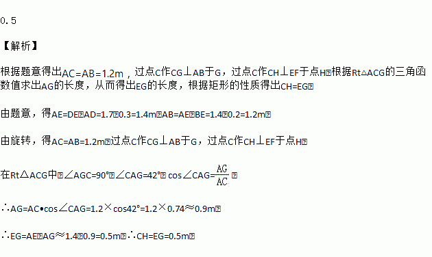 图1中是小区常见的漫步机,当人踩在踏板上,握住扶手,像走路一样抬腿,就会带动踏板连杆绕轴旋转,从侧面看图2,立柱DE高1.7m,AD长0.3m,踏板静止时从侧面看与AE上点B重合,BE长0.2m,当踏板旋转到C处时,测得∠CAB=42°,求此时点C距离地面EF的高度.(结果精确到0.1m)(参考数据:sin42°=0.67,cos42°=0.74,tan42°=0.90)