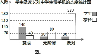 “校园手机”现象越来越受到社会的关注,“寒假”期间,记者刘凯随机调查了某区若干学生和家长对中学生带手机现象的看法,统计整理制作了如下的统计图1: