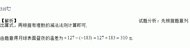 310℃ 【解析】试题分析:先根据题意列出算式,再根据有理数的减法法则计算即可. 由题意得月球表面昼夜的温差为℃.