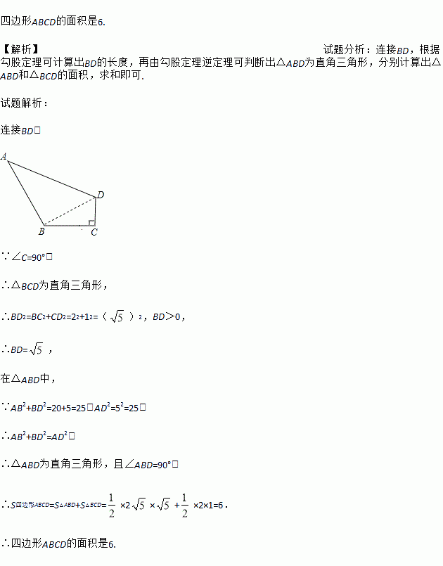(8分)如图所示,在四边形ABCD中,AB=2,BC=2,CD=1,AD=5,且∠C=90°,求四边形ABCD的面积.