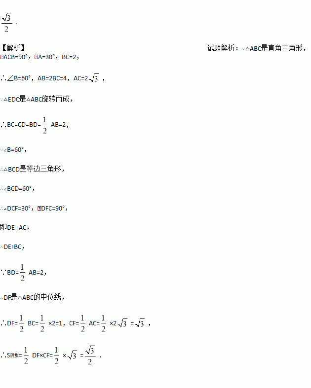 如图,在Rt△ABC中,∠A=30°,BC=2,将△ABC绕点C按顺时针方向旋转n度后,得到△EDC,此时点D在AB边上,斜边DE交AC于点F,则n=_______; 图中阴影部分的面积为____.