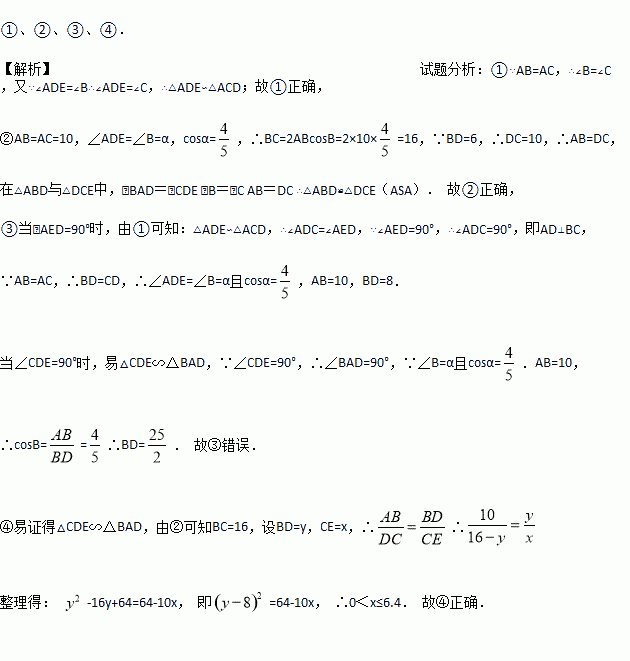 不与B,C重合),∠ADE=∠B=α,DE交AC于点E,且cosα=