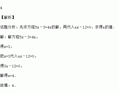 4 【解析】 试题分析:先求方程5x﹣3=4x的解,再代入ax﹣12=0,求得a的值. 【解析】 解方程5x﹣3=4x, 得x=3, 把x=3代入ax﹣12=0, 得3a﹣12=0, 解得a=4. 故填:4.
