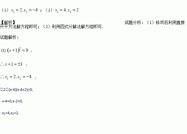 解方程:(1) (x+1)2-9=0 ;(2)(x-4)2+2(x-4)=0
