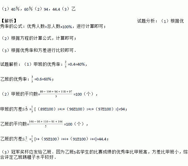 某校八年级学生开展踢毽子比赛活动,每班派5名学生参加,按团体总分多少排列名次,在规定时间内每人踢100个以上(含100)为优秀.表是成绩最好的甲班和乙班5名学生的比赛数据(单位:个):