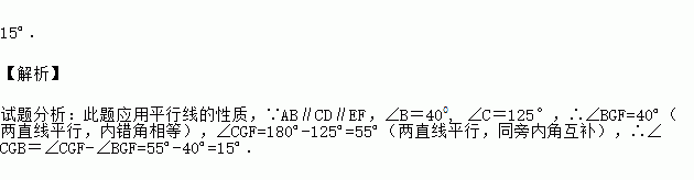 如图, 直线AB∥CD∥EF,且∠B=400, ∠C=125°, 则∠CGB=_______.