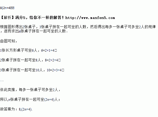 一张长方形桌子可坐6人,按下图方式将桌子拼在一起2张桌子拼在一起可坐_____人,n张桌子拼在一起可坐_____人.