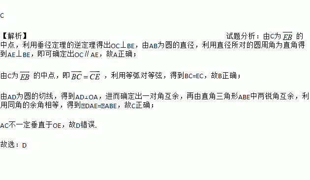 C 【解析】试题分析:由C为的中点,利用垂径定理的逆定理得出OC⊥BE,由AB为圆的直径,利用直径所对的圆周角为直角得到AE⊥BE,即可确定出OC∥AE,故A正确; 由C为的中点,即,利用等弧对等弦,得到BC=EC,故B正确; 由AD为圆的切线,得到AD⊥OA,进而确定出一对角互余,再由直角三角形ABE中两锐角互余,利用同角的余角相等,得到∠DAE=∠ABE,故C正确; A...
