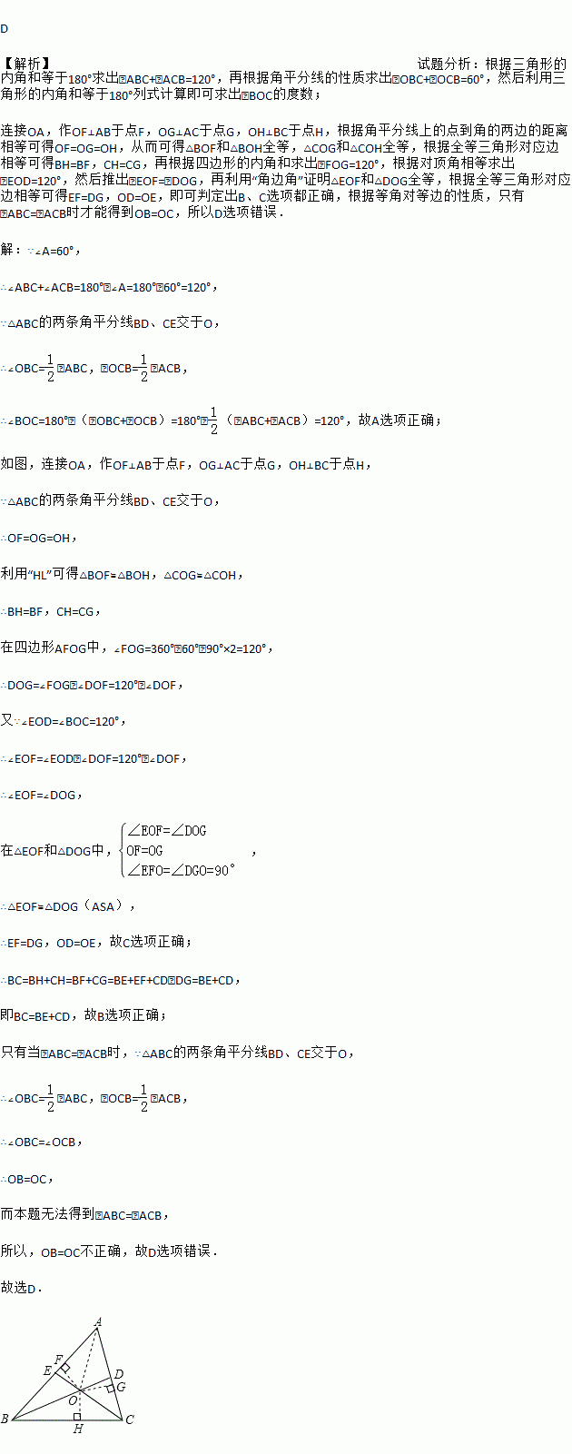 如图,△ABC的两条角平分线BD,CE交于点O,且∠A=60°,则下列结论中不正确的是( )