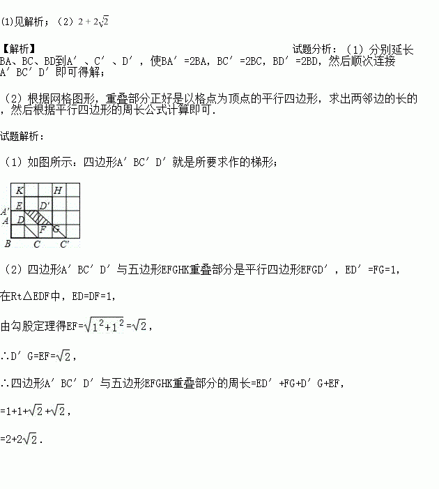 (1)以B为位似中心,在网格图中作四边形A′BC′D′,使四边形A′BC′D′和梯形ABCD位似,且位似比为2:1;