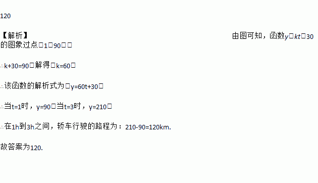 一辆轿车离开某城市的距离y(km)与行驶时间t(h)之间的关系式为y=kt+30,其图象如图所示.在1h到3h之间,轿车行驶的路程是________km.