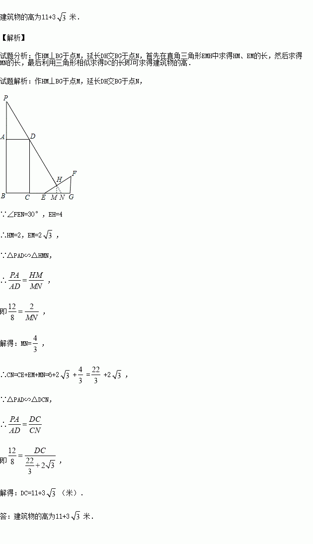 如图,一侧面为矩形的建筑物ABCD,AP为建筑物上一灯杆(垂直于地面),夜晚灯杆顶端灯亮时,EH段是建筑物在斜坡EF上的影子.己知BC=8米,AP=12米,CE=6米,斜坡EF的坡角∠FEG=30°,EH=4米,且B,C,E,G在同一水平线上,题中涉及的各点均在同一平面内,求建筑物的高度AB(结果保留根号).