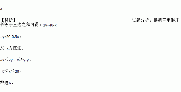 等腰三角形的周长是40cm,腰长y (cm)是底边长x (cm)的函数解析式正确的是( )