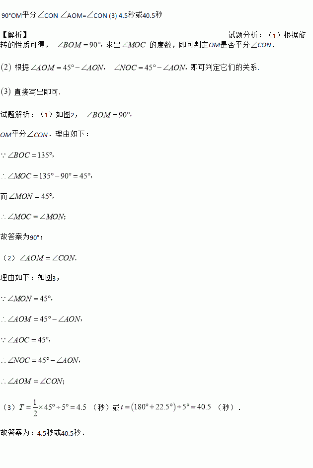 (2)紧接着将图2中的三角板绕点O逆时针继续旋转到图3的位置所示,使得ON在∠AOC的内部,请探究:∠AOM与∠CON之间的数量关系,并说明理由;