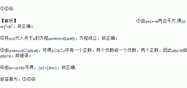 ①②④. 【解析】①由a+c=?b两边平方,得(a+c)2=b2,故正确; ②将x=1代入关于x的方程ax+b+c=0(a≠0),方程成立,故正确; ③由a+b+c=0,abc≠0,可得a,b,c中有一个正数,两个负数或一个负数,两个正数,因此abc>0或abc<0,故错误; ④由a=?(c+b)可得,|a|=|b+c|,故正确. 故答案为:①②④