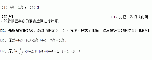 计算:(1)4+-+4; (2)-(π-)0+|-2|.
