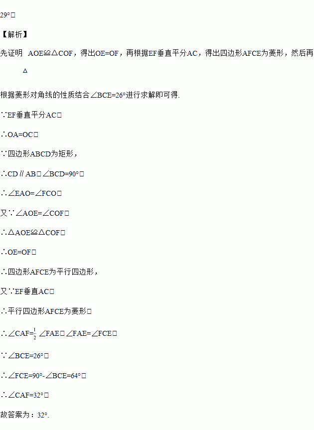 如图,在矩形ABCD中,对角线AC的垂直平分线分别交AB,CD于点E,F,连接AF,CE,如果∠BCE=26°,则∠CAF=_____