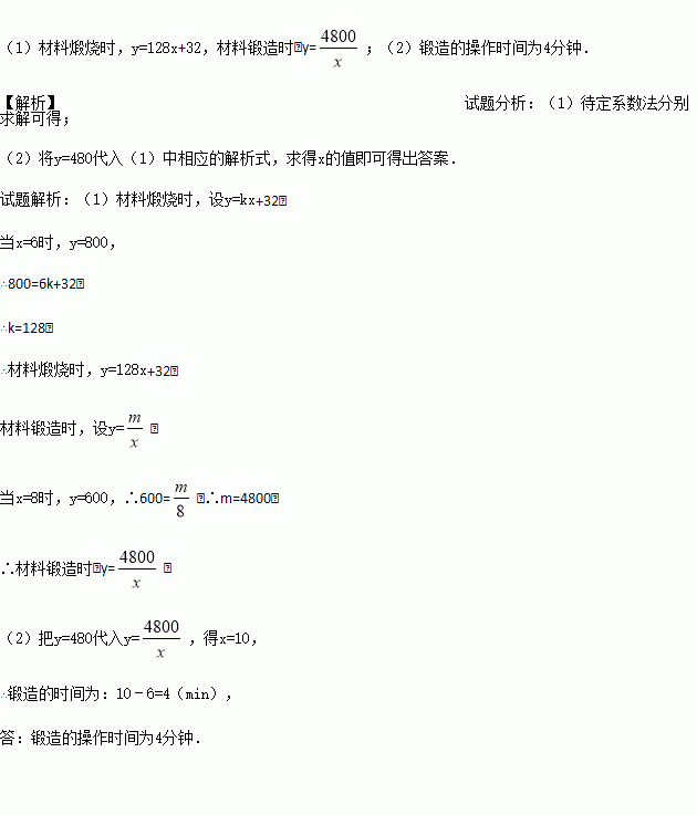 (1)分别求出材料煅烧和锻造时y与x的函数关系式;