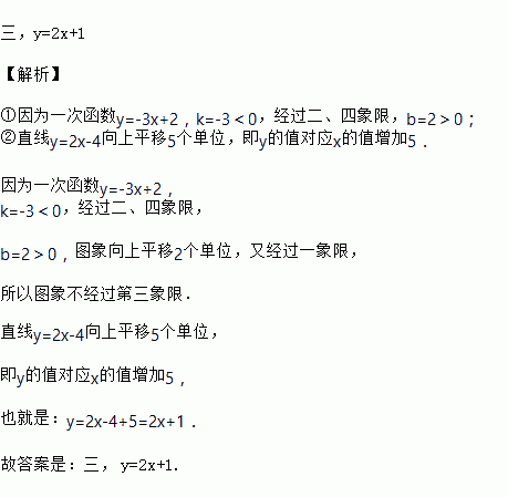 已知一次函数,它的图象不经过第________象限.将直线向上平移个单位后,所得直线的表达式是________.